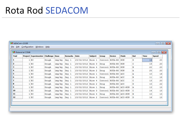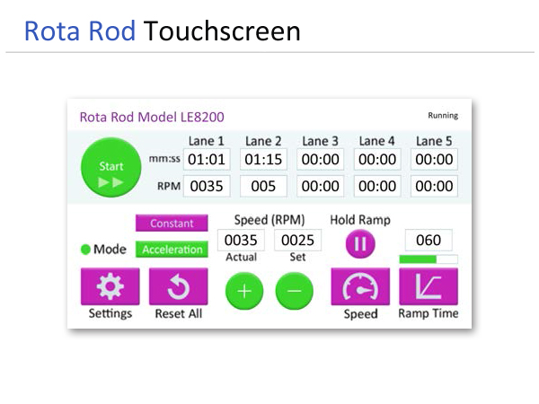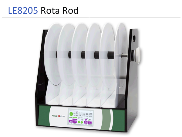 Rota Rod由先進的微處理晶片控制,可提供精確的定時控制和超精確的速度調節。此系統能夠以電子控制方式維持恆定速度(2至90 rpm)旋轉;或者,可以自定義時間(2到5999秒,以1秒為增量)並選擇目標加速度。